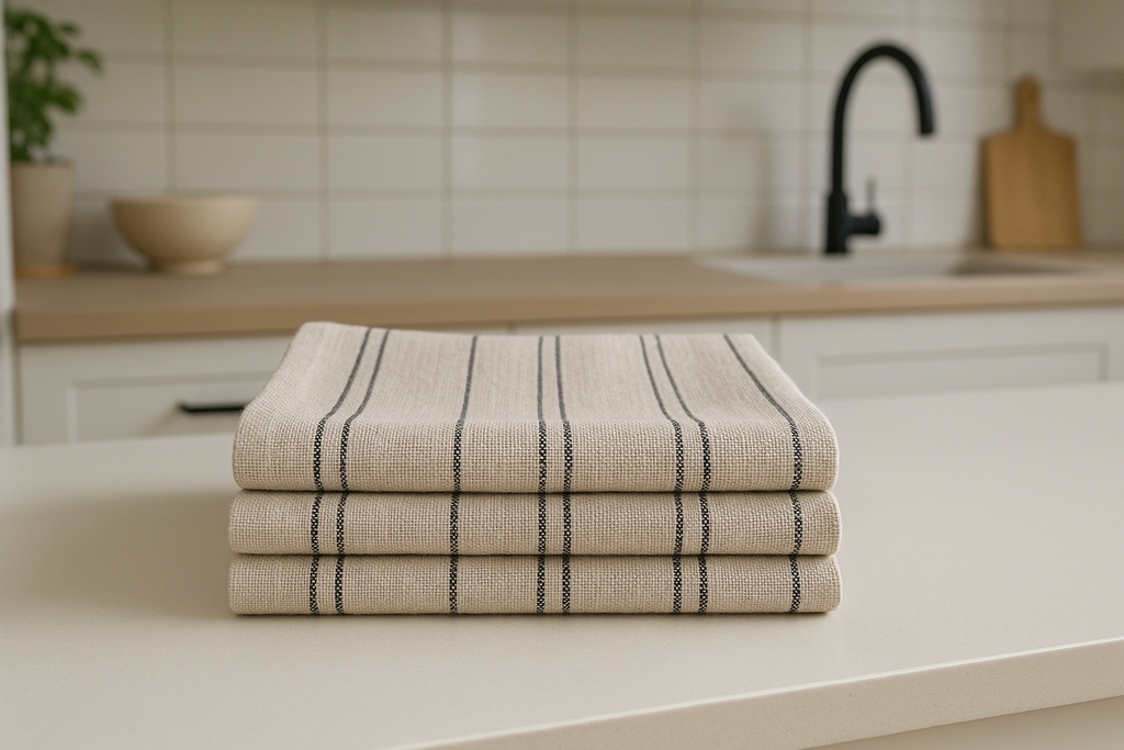 Kit com 3 panos de prato em linho natural com listras discretas. Material super absorvente que seca rapidamente e não deixa fiapos. Essencial para manter sua cozinha sempre limpa e organizada.