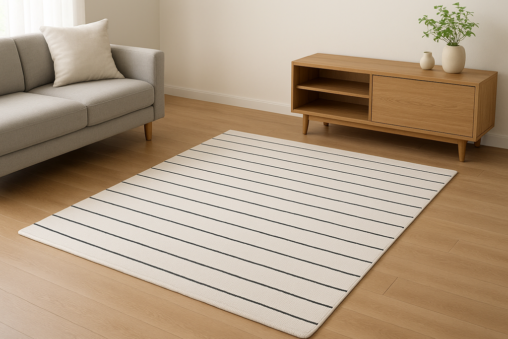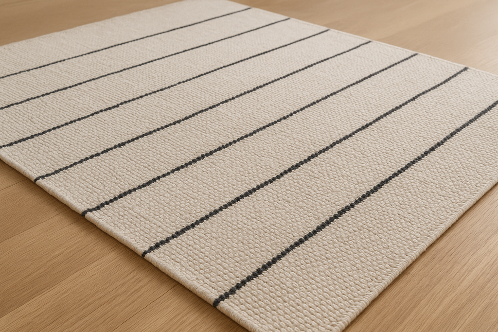 Tapete retangular em algodão com listras horizontais pretas sobre fundo branco. Design clean e moderno que combina com qualquer decoração contemporânea.